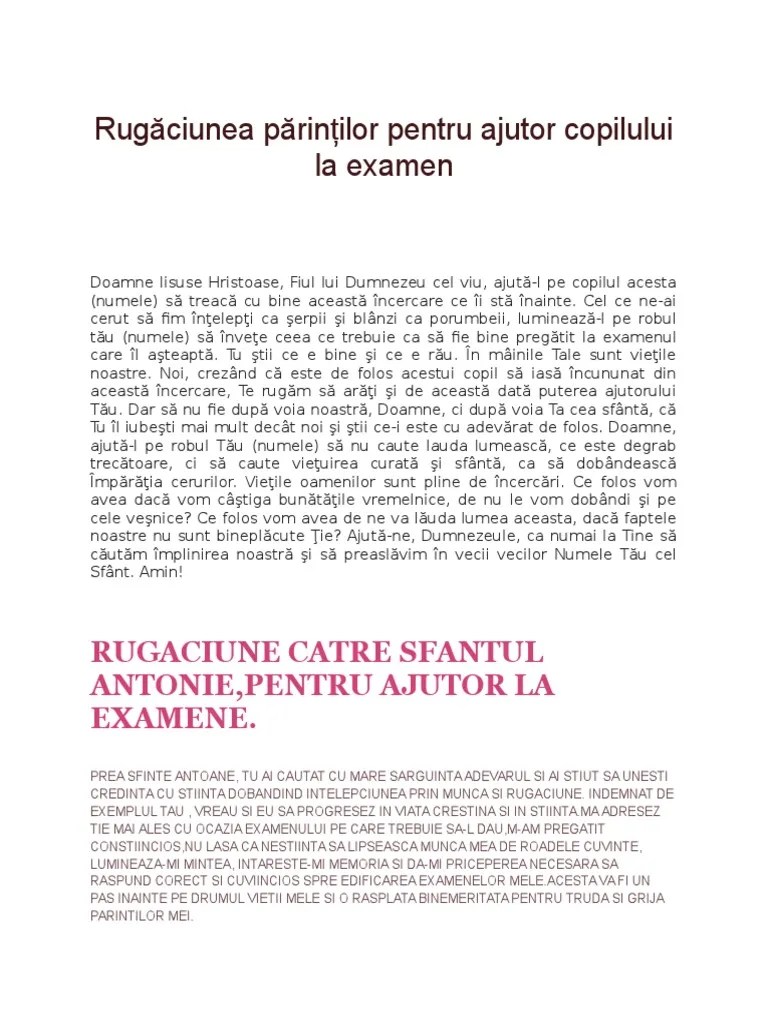 (toate numele pentru care se roagă respectivul.) În cadrul secțiunii „rugăciuni" de pe portalul doxologia.ro veți putea descoperi cele mai frumoase rugăciuni închinate mântuitorului, maicii domnului și sfinților din biserica noastră. Rugãciune pentru reusita la examen. Rugãciune pentru reusita la examen sfinte antoane, tu ai cãutat cu mare sârguintã adevãrul si ai stiut sã unesti credinta cu stiinta. Doamne, ai grijă de toți copiii și înțelepțește și pe copiii mei. Tu ai dobândit întelepciunea prin muncã si rugãciune.. De asemenea, la finalul fiecărei luni, veți găsi o selecție a celor.